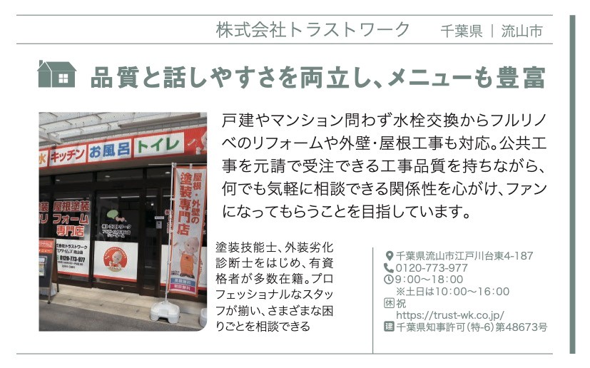 流山市・柏市・松戸市・野田市を中心にお家のリフォームを行っている!あなたの“おうちの専属工事店”を目指すトラストワークです!