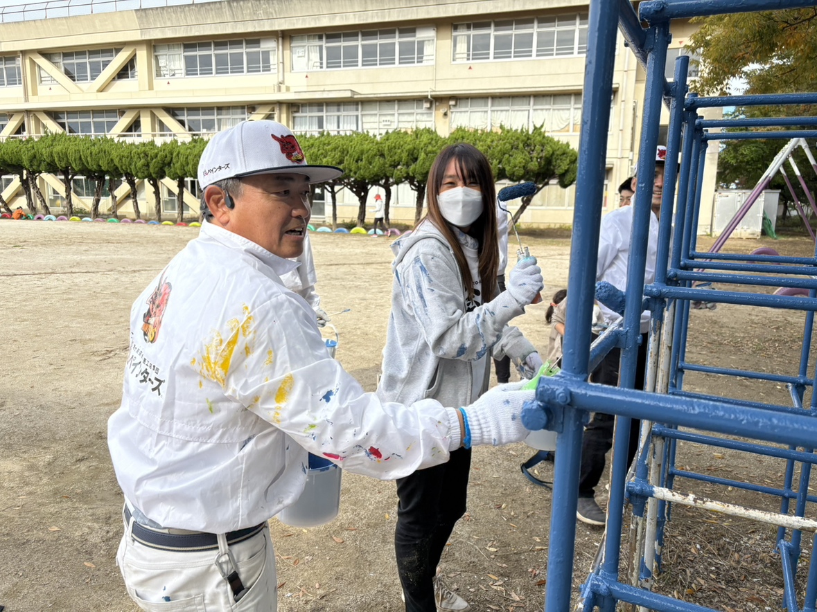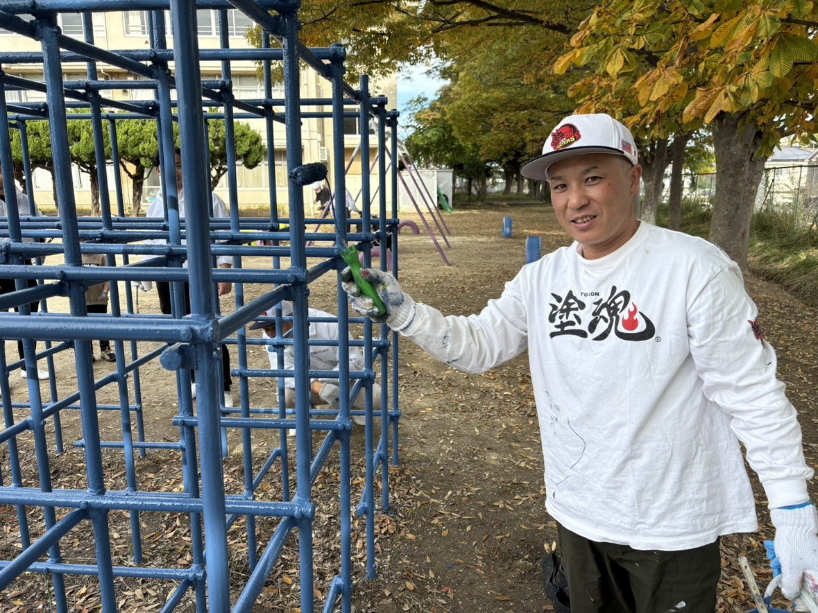 先週末11/2(日)にわたしたちトラストワークの会長の長友と社長の岡田がNPO法人塗魂ペインターズ の活動の一環で、松戸市立 貝の花小学校に伺い学校の50周年記念を祝し、運動場にある遊具の塗装作業を行って参りました!!