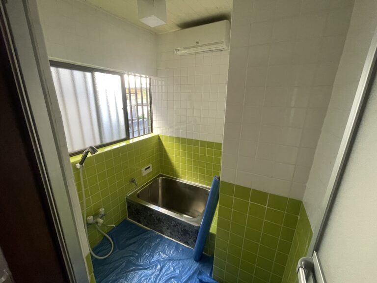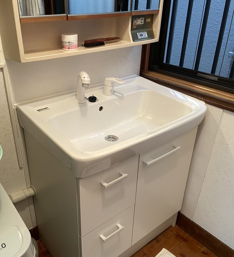 元々はタイル貼りの壁と床にステンレス浴槽という昔ながらのお風呂でしたが、寒さ対策として浴室全体のリフォーム工事と、あわせて洗面台交換工事を行いました。