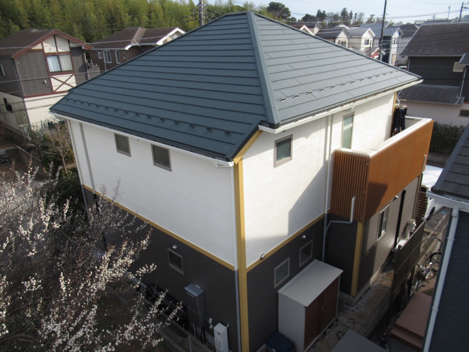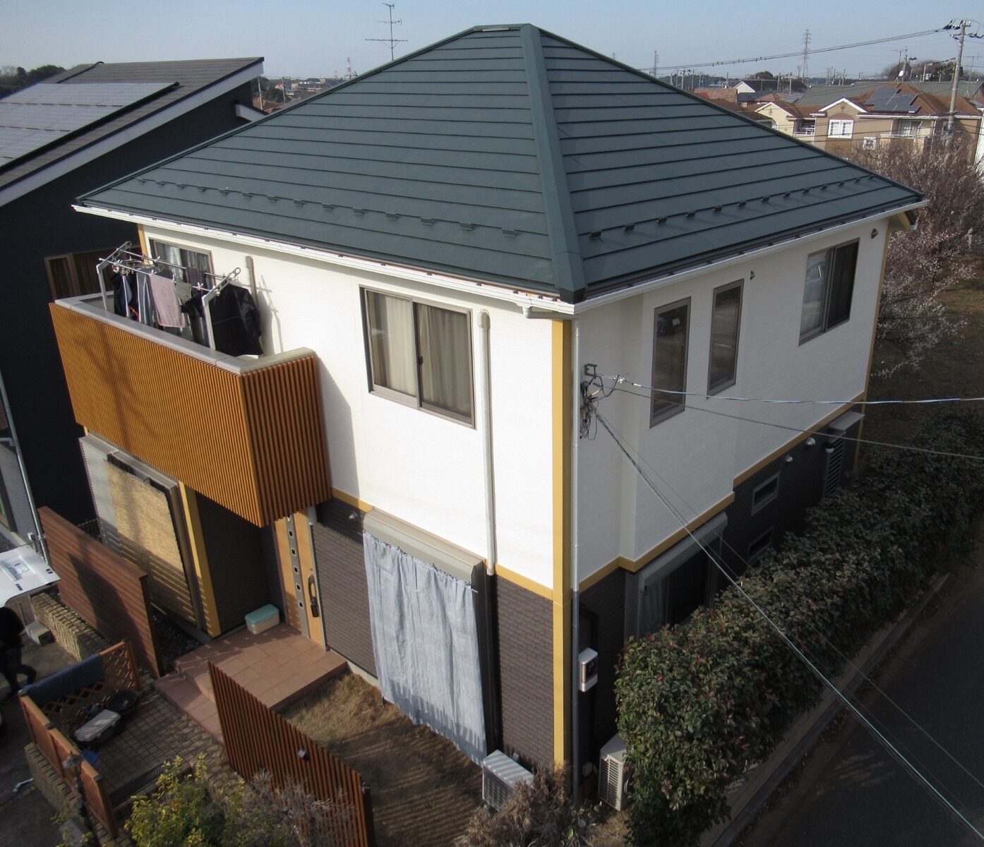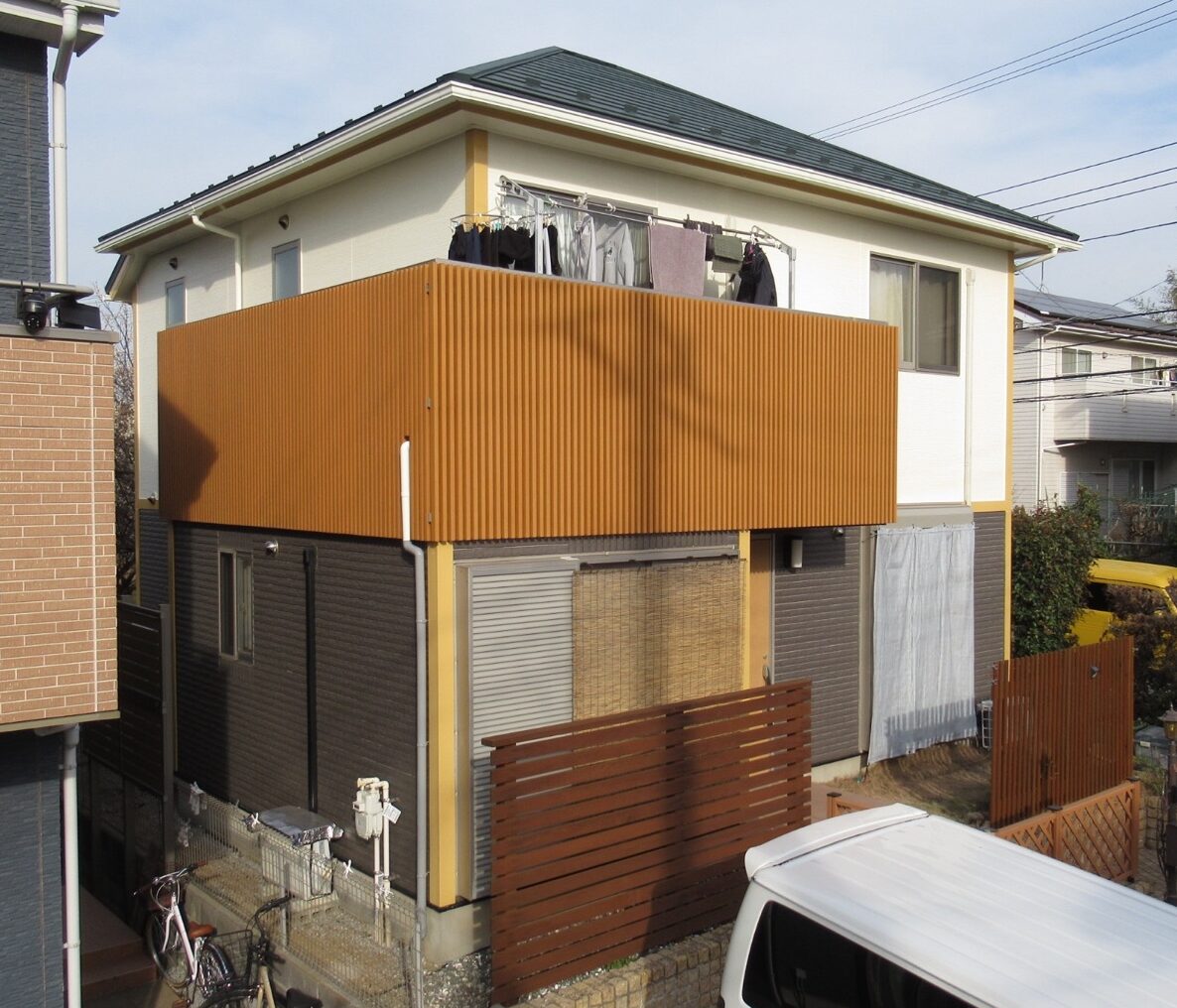 外壁の2階白色部分の塗装をしたことによってツートンカラーがより映え、「新築のようになった」とお客様にも喜んでいただけました✨